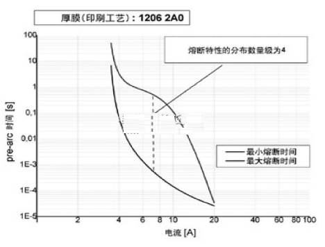在設(shè)計階段,電子工程師會碰到熔斷特性大幅變化的情況。一般來說,貼片式保險絲是低阻值的電阻,其阻值只有幾歐姆。如上所述,熔融特性與電阻值有關(guān)。如果電阻值的變化范圍很大,熔融特性也就相應地有很大變化。由于這種可能發(fā)生的變化,貼片式保險絲在碰到正常的涌流時就斷開,或是相反,在過載情況下,應該斷開時卻不斷開,這種最糟糕的情形是工程師必須避免的。圖3所示為印刷厚膜保險絲的熔斷特性典型分布。