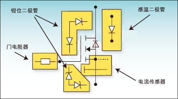突出顯示的元件組成一個(gè)特性板,可以將其中的功能集成到MOSFET中。這些元件從右上角開(kāi)始按順時(shí)針?lè)较驗(yàn)椋簻囟雀袘?yīng)二極管、電流傳感器、鉗位二極管(內(nèi)部二極管,未顯示)和門(mén)電阻器。通過(guò)加入鉗位二極管和門(mén)電阻器眾所周知的保護(hù)特性,可以保護(hù)對(duì)電壓敏感的柵氧化層免受危險(xiǎn)電場(chǎng)的破壞。