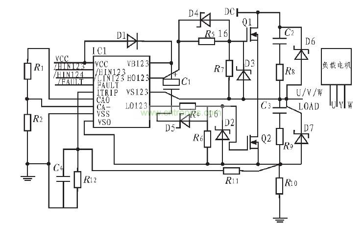 圖3是由IR2130組成的無刷直流電機驅動原理圖為便于表示只畫出其中一個橋臂的電路示意圖,通過IR2130輸入信號控制MOSFET的開關,由此驅動無刷直流動機。C1是自舉電容,為上橋臂功率管驅動的懸浮電源存儲能量,D1的作用是防止上橋臂導通時母線電壓倒流到IR2130的電源上而使器件損壞,因此D1應有足夠的反向耐壓,當然D1與C1串聯也是為了滿足主電路功率開關頻率的要求,D1應選快速恢復二極管。  R1、R2、R10、R11、R12、C4組成過流檢測電路。R5、R6為柵極驅動電阻,D4、D5為功率管提供了一個低阻抗的放電回路,使功率管能夠快速的泄放電荷。