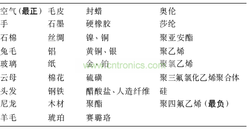 表1列出了不同材料摩擦起電的電荷特性,如玻璃、尼龍帶t1:電,硅、聚四氟乙烯帶負電。材料的導電性也對材料表面建立電荷的能力有影響,許多材料的導電性或表面電阻很大程度上取決于濕度,濕度越低導電能力越低,越容易阻止電荷的遷移使其停