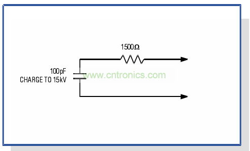 建立。針對不同情形可以用幾種公認的模型描述帶電人體,最為通行的模型(圖2)是充電到15,OOOV的100pF電容與1500。電阻串聯。