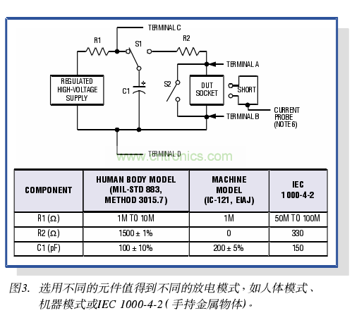 有兩種方法一均符合上述要求一已被設備制造商廣泛采用,來測試I/O端口的ESD防護能力(圖3)第一種方法修改自Method 3015.7 > MIL-STD-883它采用了與原來方法相同的電路模型和波形,但只將ESD脈沖施加于器件的I/o引腳。這種方法的口的是模擬已安裝于線路板并運行于口標系統中的Ic所遭遇的故障電流。