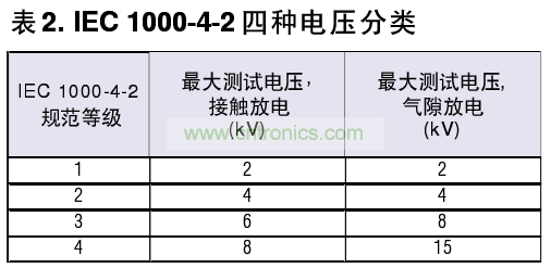 第二種方法是IEC 1000-4-2 >現已成為國際標準。相比Method 3015.7測試條件,它規定了更高的電容和更低的電阻}IE C 1000-4-2被廣泛地)II于測試終端設備的接口(表2)。值得一提的是> Maxim公司的模擬開關和RS-232/RS-485接口IC完個符合這些ESD標準,且無須外圍兒件。