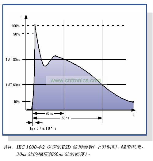 .采用模擬人體產生的靜電放電波形進行測試。不同電路模型規定不同的幅值、上升/下降時間和功率。