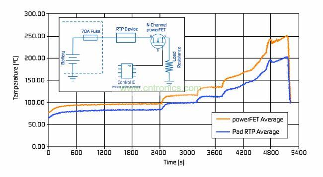 圖4:在緩慢的熱失控情況下,RTP200器件會(huì)追蹤powerFET溫度,當(dāng)溫度達(dá)到200℃時(shí),它就會(huì)斷開電路。