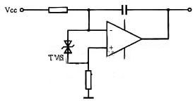 圖2是一個直流穩壓電源,在其穩壓輸出端加上TVS,可以保護使用該電源的儀器設備,同時還可以吸收電路中晶體管的集電極到發射極間的峰值電壓,從而保護晶體管。建議在每個穩壓源的輸出端增加一個TVS管,這樣可以大幅度地提高整機的可靠性。