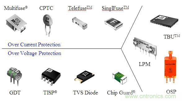 相對過壓的保護元件,過流的保護元件主要分成圖示上部分的幾塊,右邊的元件反應速度快,但通流量較小,而左邊的元件相反,所以需要做一些搭配。主要是整合器的元器件,如TBU。TBU把過流和過壓的元器件組合在一起,可同時進行過流和過壓保護。