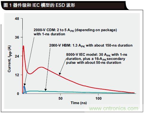 3、兩種模型在測試期間所用的電擊次數不同。HBM僅要求測試一次正電擊和一次負電擊,而 IEC 模型卻要求 10 次正電擊和 10 次負電擊。可能出現的情況是,器件能夠承受第一次電擊,但由于初次電擊帶來的損壞仍然存在,其會在后續電擊中失效。圖1 顯示了 CDM、HBM 和 IEC 模型的 ESD 波形舉例。很