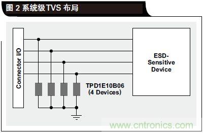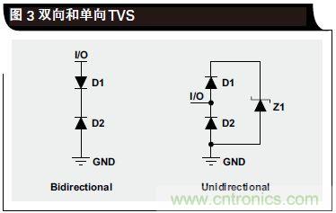 立即沿這條通路接地。在單向 TVS 情況下,只要 D2 和Z1 都不進入其擊穿區域,則電壓信號會在接地電壓以上擺動。當正ESD電擊擊中I/O線路時,D1變為正向偏置,而Z1 先于 D2 進入其擊穿區域;通過 D1 和 Z1 形成一條接地通路,從而讓 ESD 能量得到耗散。當發生負ESD 事件時,D2 變為正向偏置,ESD能量通過 D2接地通路得到耗散。由于 D1 和 D2 尺寸可以更小、寄生電容更少,單向二極管可用于許多高速應用;D1 和 D2 可以“隱藏”更大的齊納二極管 Z1(大尺寸的原因是處理擊穿區域更多的電流)。