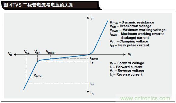 圖 4 顯示了 TVS 二極管電流與電壓特性的對比情況。盡管 TVS 是一種簡單的結構,但是在系統級 ESD 保護設計過程中仍然需要注意幾個重要的參數。這些參數包括擊穿電壓 VBR、動態電阻 RDYN、鉗位電壓 VCL 和電容。