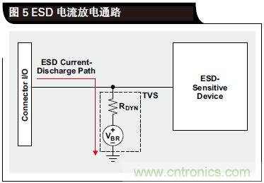 ESD 是一種極速事件,也就是幾納秒的事情。在如此短的時間內,TVS 傳導接地通路不會立即建立起來,并且在通路中存在一定的電阻。這種電阻被稱作動態電阻(RDYN),如圖 5 所示。