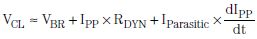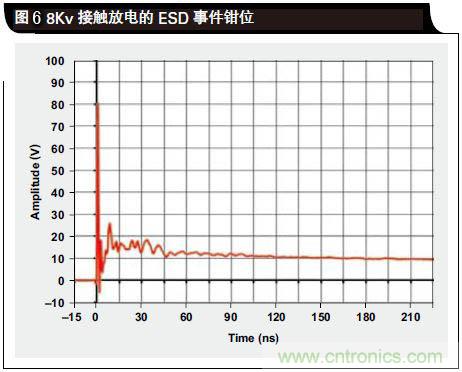 由于ESD是一種極速瞬態事件,I/O路線的電壓不能立即得到鉗制。如圖6所示,根據IEC 61000-4-2標準,數千伏電壓被鉗制為數十伏。如方程式1所示,RDYN越小,鉗位性能也就越好:其中,IPP為ESD事件期間的峰值脈沖電流,而Iparasitic為通過TVS接地來自連接器的線路寄生電感。