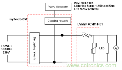 2Pro AC 器件一個(gè)常見的應(yīng)用是 LED 照明,其雷擊的保護(hù)要求都小于 2kV surge,2Pro AC 正好可以防護(hù) 2kV 的雷擊。下圖是不久前網(wǎng)友調(diào)試的一塊客戶 LED 電路板示意圖,雷擊要求是 2kV,把 2Pro AC 放置于 LED lighting 電路輸入端,再加上雷擊波形發(fā)生器和交流耦合。