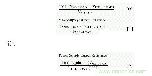 利用[12]式,可計算出RBISTABLE為0.320Ω。方程[9]的圖形表明,電源效率隨著RS的增加而跌落,在RS = RBISTABLE時跌落達20%。注意:該結論并不具有普遍性,對于每個應用,必須分別進行計算。RS的來源之一,是所有電源無法避免的、有限的輸出電阻,它可通過負載調整來確定,后者通常定義為:
