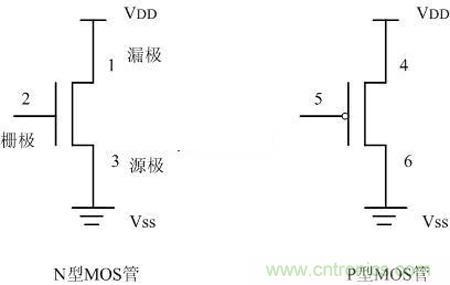 以N型管為例,2端為控制端,稱為“柵極”;3端通常接地,稱為“源極”;源極電壓記作Vss,1端接正電壓,稱為“漏極”,漏極電壓記作VDD。要使1端與3端導通,柵極2上要加高電平。