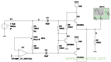 從仿真結(jié)果可以看出輸出的波形比輸入波形稍往上有個(gè)偏移。這是由于 Q1 將Q2 和 Q3 的基極電位抬高使得 Q2和Q3處于微微開(kāi)啟狀態(tài),也就是當(dāng)輸入信號(hào)為0時(shí),輸出也是稍有些電壓的。不過(guò)這個(gè)偏移很小,只有幾十mV。對(duì)大多數(shù)的應(yīng)用來(lái)說(shuō)沒(méi)有太大的影響。如果對(duì)此很在意,可以適當(dāng)?shù)募哟驲6的阻值,R6增大,Q1的基極電流降級(jí), 發(fā)射結(jié)壓降降低,Q2、Q3的基極靜態(tài)工作點(diǎn)同樣也會(huì)降低。