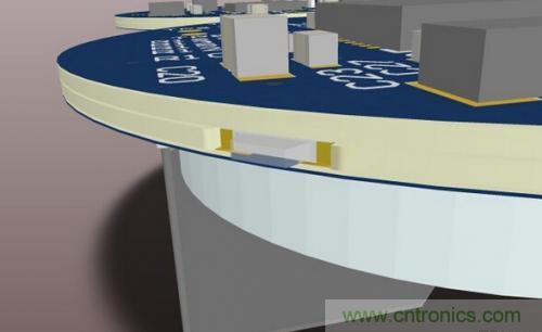 為了利用這一功能,Altium Designer 14 (AD14)支持名為Cavity Definition的Region屬性,可以將Height屬性與Region相聯系,允許在任意信號層鋪放元件。為了能夠完全嵌入,元件的凹槽必須延伸至PCB板邊緣,從而在側邊開放,這一點在嵌入貼片LED時尤為重要。如圖2所示,利用Altium Designer 14設計的在圓形PCB板上用于裝配貼片LED的凹槽。
