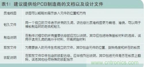 在設計嵌入元件時,為了確保成功無誤,重要的一點是與PCB制造商充分的溝通,表1中羅列出了建議提供給PCB制造商的文檔以及設計文件。