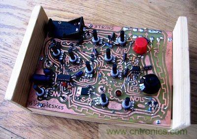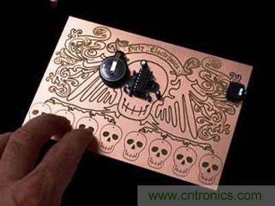 接著是跟前面的街頭涂鴉風(fēng)格完全不同的另一款迷你合成器電路板;電路板上并列的那一排骷髏是合成器的鍵盤,振蕩器(oscillator)的間距是由皮膚接觸的電平來控制。事實上,玩這個小東西的秘訣是,在開始彈奏之前先舔一舔(?!)指尖…