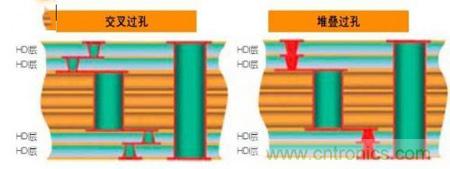 推薦使用深度最多6層的盲孔/埋孔配置。層數再多會引起制造良率問題。優選技術是使用交叉過孔或堆疊過孔,如圖8所示。交叉過孔允許更加精確的注冊公差,因為它們不像堆疊過孔那樣強制要求完美對齊。