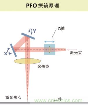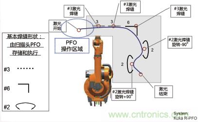 除了激光拼焊,激光飛行焊也已經(jīng)被廣泛應(yīng)用于汽車車身及其他零部件的焊接。激光飛行焊是將振鏡焊接頭與機器人的運動結(jié)合起來,實現(xiàn)高效靈活的激光焊接。振鏡(PFO)及飛行焊的原理見圖4、5、6。其中PFO可以通過兩片鏡片的旋轉(zhuǎn),實現(xiàn)激光焦點在工件上的快速靈活移動和定位,可以大大提供激光焊接時的動態(tài)性能,更加高效。而機器人則可以擴展焊接范圍,以實現(xiàn)更大零件的焊接。兩者的結(jié)合,則可以實現(xiàn)優(yōu)勢互補,達(dá)到高效、靈活、低成本的激光焊接。