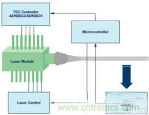上述系統的一般框圖如圖1所示。激光二極管、TEC和熱敏電阻位于激光模塊內部。TEC控制器ADN8833或ADN8834讀取熱敏電阻的反饋電壓,并向TEC提供驅動電壓。使用微控制器監測和控制熱環路。注意,熱環路也可以在模擬電路中構建。ADN8834內置兩個零漂移斬波放大器,可將其用作PID補償器。
