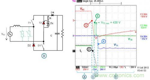 我們在90°相角施加4KV正浪涌電壓,如圖2的示意圖所示 (無PFC)。為模擬最惡劣的應用環境,我們為L選用一個2 µH電感,C是一個100 µF電容。可控硅整流管是兩個50A的TN5050H-12WY,而D1、D2和D4二極管(PFC旁通二極管)是STBR6012-Y整流管。
