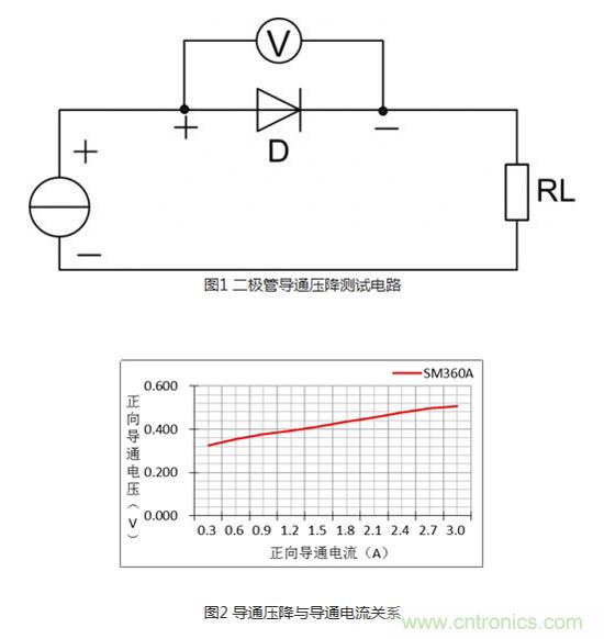 在二極管兩端加正向偏置電壓時,其內部電場區域變窄,可以有較大的正向擴散電流通過PN結。只有當正向電壓達到某一數值(這一數值稱為“門檻電壓”,鍺管約為0.2V,硅管約為0.6V)以后,二極管才能真正導通。但二極管的導通壓降是恒定不變的嗎?它與正向擴散電流又存在什么樣的關系?通過下圖1的測試電路在常溫下對型號為SM360A的二極管進行導通電流與導通壓降的關系測試,可得到如圖2所示的曲線關系:正向導通壓降與導通電流成正比,其浮動壓差為0.2V。從輕載導通電流到額定導通電流的壓差雖僅為0.2V,但對于功率二極管來說它不僅影響效率也影響二極管的溫升,所以在價格條件允許下,盡量選擇導通壓降小、額定工作電流較實際電流高一倍的二極管。