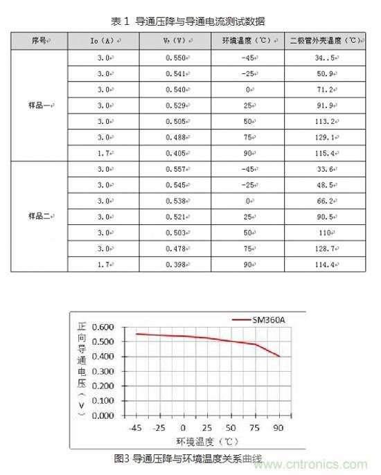 在我們開發產品的過程中,高低溫環境對電子元器件的影響才是產品穩定工作的最大障礙。環境溫度對絕大部分電子元器件的影響無疑是巨大的,二極管當然也不例外,在高低溫環境下通過對SM360A的實測數據表1與圖3的關系曲線可知道:二極管的導通壓降與環境溫度成反比。在環境溫度為-45℃時雖導通壓降最大,卻不影響二極管的穩定性,但在環境溫度為75℃時,外殼溫度卻已超過了數據手冊給出的125℃,則該二極管在75℃時就必須降額使用。這也是為什么開關電源在某一個高溫點需要降額使用的因素之一。