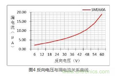 在二極管兩端加反向電壓時,其內部電場區域變寬,有較少的漂移電流通過PN結,形成我們所說的漏電流。漏電流也是評估二極管性能的重要參數,二極管漏電流過大不僅使其自身溫升高,對于功率電路來說也會影響其效率,不同反向電壓下的漏電流是不同的,關系如圖4所示:反向電壓愈大,漏電流越大,在常溫下肖特基管的漏電流可忽略。