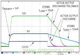 就高于 7V 左右的輸出電壓而言,LT3066 實施主動輸出放電折返,因此,用來主動輸出放電的晶體管之驅動降低了,這可限制該器件消耗的功率。由于產生了折返,所以在示波器顯示屏上看到,LT3066 的 12V 波形從 12V 到 7V 的放電速度不那么快。在輸出電壓很高和使用大型電容器時,或者萬一發生故障,使輸出短路至很高的電壓時,這樣的放電速度可以保護 LT3066 免于損壞。