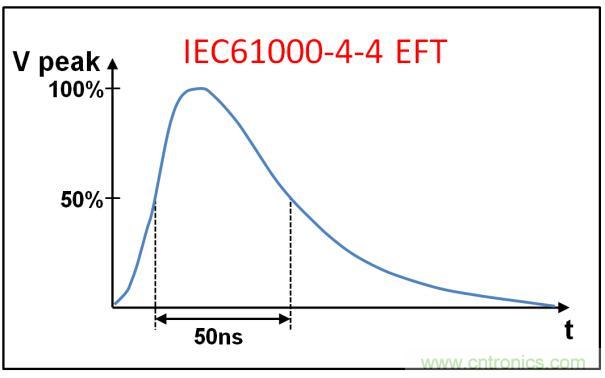 電快速瞬變(EFT)測試的是,將大量極快的瞬變脈沖耦合到信號線上,系統與外部開關電路關聯的瞬變干擾,這類電路能夠以容性方式耦合至通信端口。EFT的纏上包括繼電器和開關觸點抖動,或者因為感性或容性負載切換而產生的瞬變, 而所有這些在工業環境中都很常見。EC 61000-4-4中定義的 EFT測試,就是去模擬這些事件產生的干擾。