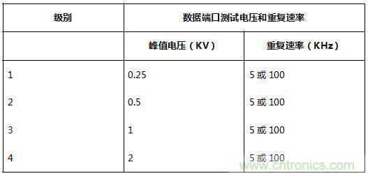 IEC 61000-4-4規定了不同環境狀況下的電壓測試級別,分為4級。同時規定了不同測試級別對應的測試電壓和脈沖重復速率。