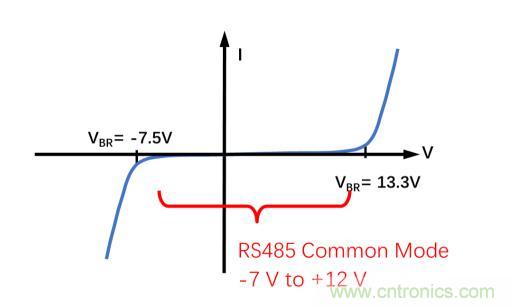 重要的是要確保TVS的擊穿電壓在受保護引腳的正常工作范圍之外。CDSOT23-SM712的獨有特性是具有+13.3 V和–7.5 V的非對稱擊穿電壓,與RS-485芯片ADM3485E的+12 V至–7 V的收發器共模范圍相匹配,從而提供最佳保護,同時最大限度地減小對RS-485收發器的過壓應力。