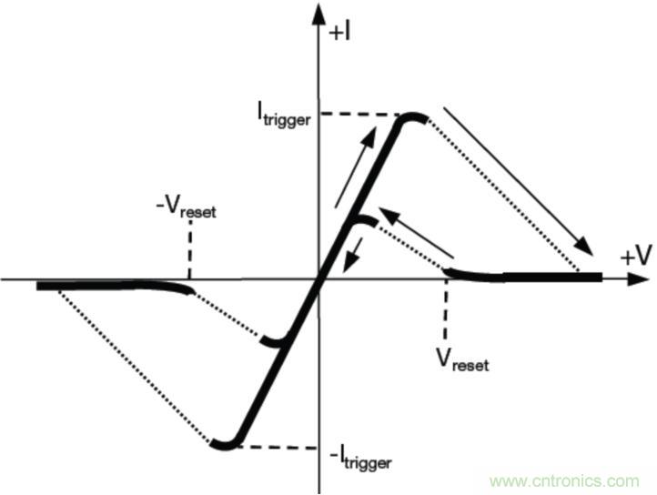 TISP的非線性電壓-電流特性通過轉移產生的電流來限制過壓。作為晶閘管,TISP具有非連續電壓-電流特性,它是由于高電壓區和低電壓區之間的切換動作而導致的。在TISP器件切換到低電壓狀態之前,它具有低阻抗接地路徑以分流瞬變能量,雪崩擊穿區域則導致了箝位動作。
