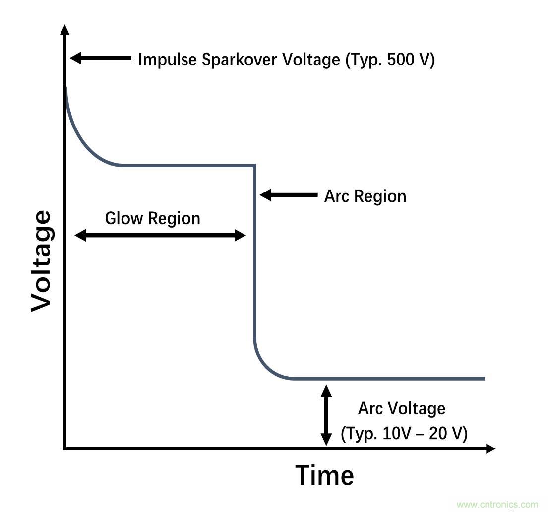 GDT主要用作主保護器件,提供低阻抗接地路徑以防止過壓瞬變。當瞬變電壓達到GDT火花放電電壓時,GDT將從高阻抗關閉狀態切換到電弧模式。在電弧模式下,GDT成為虛擬短路,提供瞬變開路電流接地泄放路徑,將瞬變沖擊電流從受保護器件上轉移開。