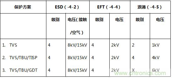 按照以上的規范要求和設計原則,下面我們提供三種不同級別的EMC防護解決方案,這些方案都已經經過了第三方獨立EMC兼容性測試的認證。方案中用到的元器件包括: