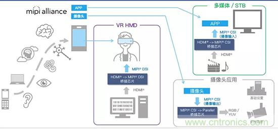 例如VR技術,VR是使用高清晰的小型顯示設備,其實這是從原來的智能手機顯示屏發展而來。智能手機主要使用MIPI等接口方式,但是VR是從PC轉變來的,它采用了大量高清晰度圖像。主要使用HDMI接口。隨著手機進入到VR領域,就會遇到接口不統一的挑戰。
