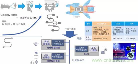 他表示隨著自動駕駛和車聯網的發展,汽車搭載越來越多的傳感器和越來越多的攝像頭。這帶來的挑戰就是數據傳輸需求越來越高。為了提升數據傳輸,車內線纜會長達到幾公里重達幾十公斤,為了簡化連接,汽車行業推出了新的車專用以太網,它可與現有的車載用車身數據通訊系統通信,所以激發了車載以太網橋接芯片的需求。