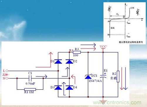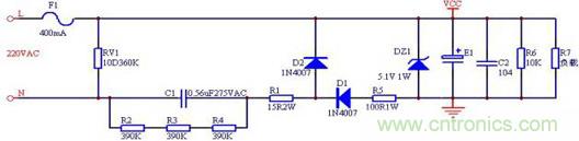 采用半波整流方式,根據(jù)計算式I1=0.5|I|=34500C可知,C=0.43uF。所以此處選用0.47uF的電容,反過來可以驗證提供的電流I1=34500C=16.2mA,多余電流從穩(wěn)壓管流過。