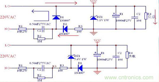 阻容降壓是一種利用電容在一定頻率的交流信號下產(chǎn)生的容抗來限制最大工作電流的電路。