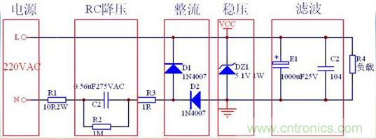 阻容降壓電路由降壓模塊、整流模塊、穩(wěn)壓模塊和濾波模塊組成。