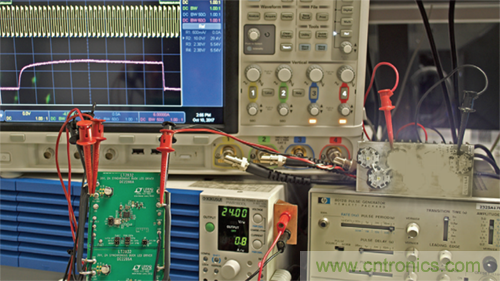 LT3932演示電路(DC2286A)設(shè)計(jì)為通過一個(gè)或兩個(gè)LED(作為降壓LED驅(qū)動(dòng)器)驅(qū)動(dòng)1 A的LED電流。如圖1所示,它很容易進(jìn)行更改和并聯(lián),以實(shí)現(xiàn)更高電流、更高電壓或并聯(lián)運(yùn)行。圖4顯示了如何將兩個(gè)這樣的電路輕松連接在一起,從24 V輸入以10μs、3 A脈沖驅(qū)動(dòng)4個(gè)LED。出于測(cè)試目的,脈沖發(fā)生器可用于提供同步時(shí)鐘信號(hào),如圖4所示。在量產(chǎn)機(jī)器視覺系統(tǒng)中,可利用時(shí)鐘芯片生成同步時(shí)鐘信號(hào)和PWM脈沖。如需更高電流脈沖,可使用相同的并聯(lián)方案添加更多演示電路DC2286A轉(zhuǎn)換器。