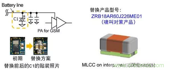 替換方案如下所示。替換產品選擇嘯叫對策用MLCC、ZRB18系列。如下面貼裝照片所示,貼裝面積減少50%。