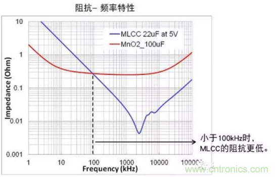 由上圖可知,大于100kHz頻率時,與Ta電容器(MnO2) 100uF相比,盡管MLCC 22uF的靜電容量小,但其阻抗更小。這是因為MLCC的ESR、ESL更小。