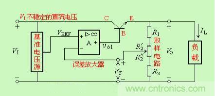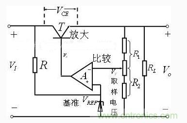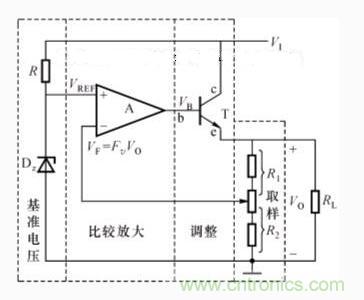 VI是整流濾波后的電壓,T為調(diào)整管,A為比較放大電路,VREF為基準電壓,它由穩(wěn)壓管Dz與限流電阻R構(gòu)成。R1與R2組成反饋網(wǎng)絡,是用來反映輸出電壓變化的取樣環(huán)節(jié)。