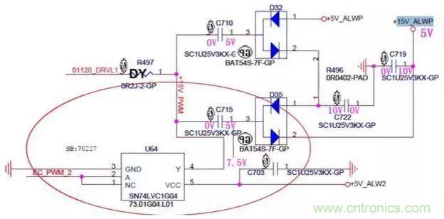 1.由于電容兩端的電壓不能突變,此時C715兩端的電壓為左邊5V,右邊為10V,然后電流經過D35的2引腳對C719電容充電,充完電后C719的電壓升到了10V。