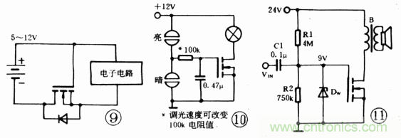 一種簡單的觸摸調光電路如圖10。當手指觸摸上觸頭時,電容經手指電阻及100k充電,VGS漸增大,燈漸亮;當觸摸下觸頭時,電容經