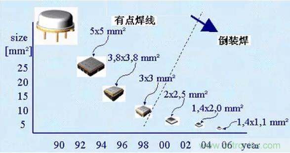 2)改進(jìn)器件的封裝形式,現(xiàn)在已經(jīng)由傳統(tǒng)的圓形金屬殼封裝改為方形或長方形扁平金屬封裝或LCCC(無引線陶瓷芯片載體)表面貼裝的形式,采用體積更小的CSP封裝形式,目前封裝尺寸已做到1.1mm x 0.9mm;