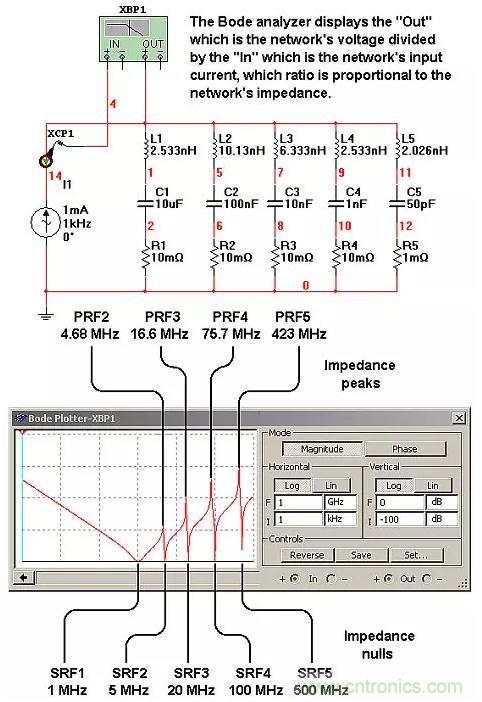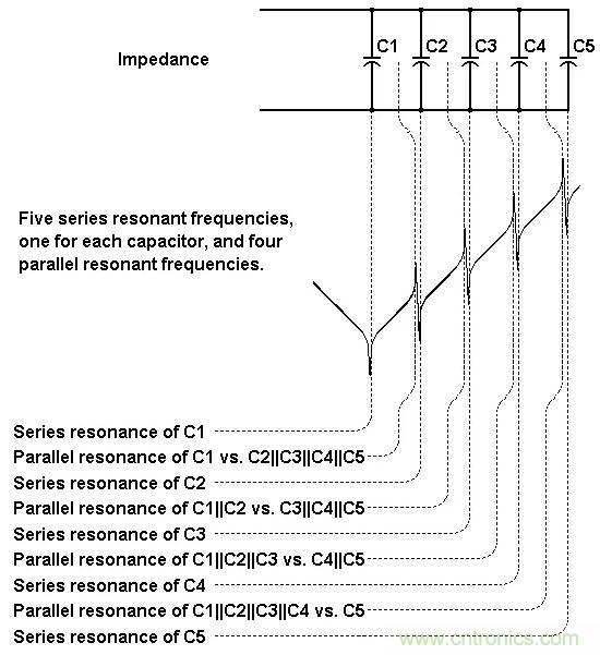 請記住,這五種電容每一個都不是單獨的電容器,而是一個串聯組合,包括電容器、電感器和電阻器。總之,它們由串聯的RLC電路構成,將在串聯諧振頻率(SRF)處表現出串聯諧振,其中SRF=1/(2 × π ×√ (L × C))。對于如上所述并聯連接的五個電容的組合,將會有五個串聯諧振頻率,并且還會有四個并聯諧振頻率,如圖1所示。